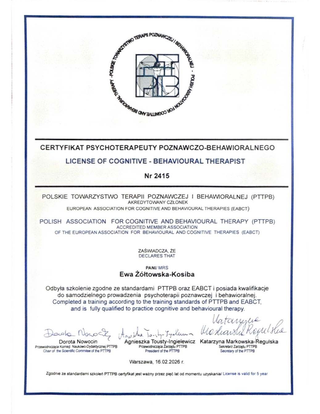 Jestem psychologiem i certyfikowaną psychoterapeutką poznawczo-behawioralną (Certyfikat PTTPB nr 2415). Ukończyłam Psychologię o specjalności psychologia kliniczna na Uniwersytecie Humanistyczno-Społecznym SWPS we Wrocławiu. Moje dodatkowe kwalifikacje obejmują roczne studium Interwencji Kryzysowej realizowane przez ITPB w podejściu poznawczo-behawioralnym, z elementami Terapii Akceptacji i Zaangażowania oraz humanistycznym, a także całościowe szkolenie DBT Comprehensive, organizowane przez PTDBT. Obecnie uczestniczę w akredytowanym szkoleniu z terapii schematu dla par.
