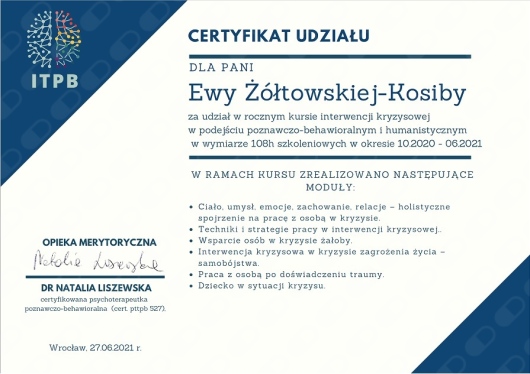 Moje dodatkowe kwalifikacje obejmują roczne studium Interwencji Kryzysowej realizowane przez ITPB w podejściu poznawczo-behawioralnym, z elementami Terapii Akceptacji i Zaangażowania oraz humanistycznym, a także całościowe szkolenie DBT Comprehensive, organizowane przez PTDBT. Obecnie szkolę się w terapii schematu i terapii par.